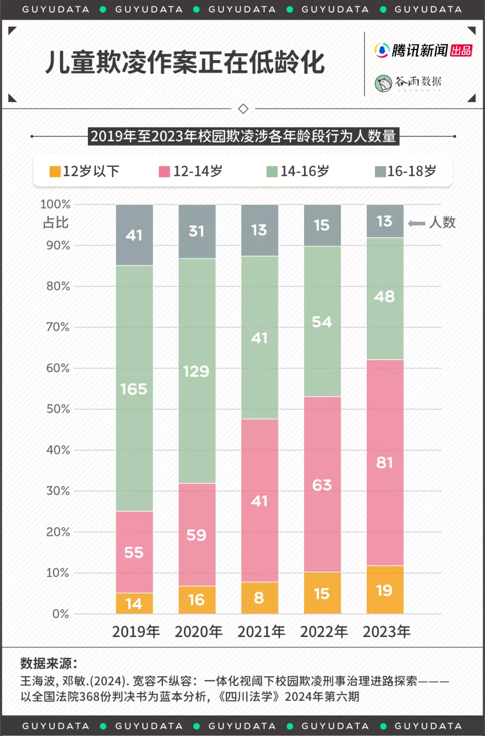 尽管缺乏国内小学欺凌发生率的详实数据,但司法判决结果可以印证校园欺凌的低龄化趋势。据《四川法学》刊载研究统计,2019年至2023年,校园欺凌涉案人数低龄化。12岁以下儿童的涉案人数从2019年的14人增长至2023年的19人,12-14岁年龄段从55人激增至81人,占比超60%。这个年龄段,恰好对应小学高年级迈向初中的阶段。