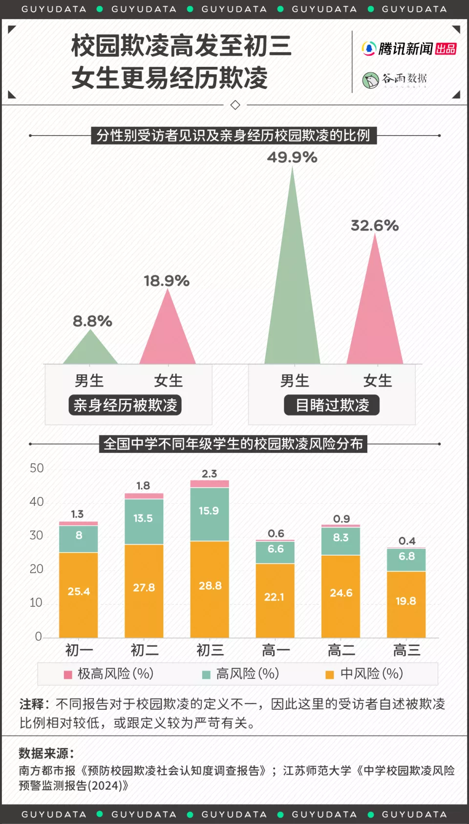 但需要明确普通高中与职高的差异:华中科技大学学者的调研发现,职业学校学生的反欺凌态度显著弱于普高与初中,欺凌涉入率也更高,这也会拉高高中阶段的平均水平。