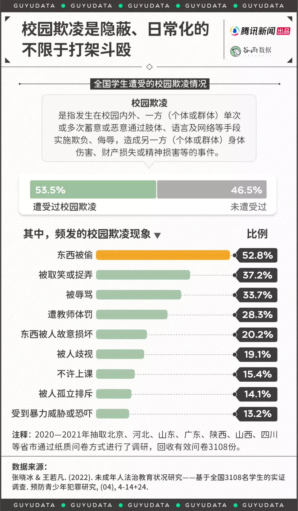 它不仅指拳打脚踢的肢体冲突。很多时候,学生之间并没有动手动脚,但对某一个人灌注了极大的精神侮辱,比如起绰号、孤立他,耻笑他,类似于家暴当中的精神暴力,同样能将一个人置于高压、恐惧乃至绝望之下。