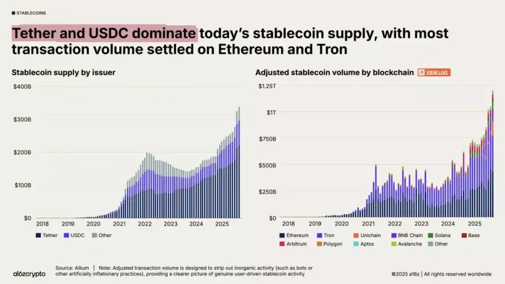 最新数据显示,在 2025 年初,Tron 和 Ethereum 两条链合计就约占 USDT 总流通量的 90%。其中 Tron 约 50 %,Ethereum 约 40 %。