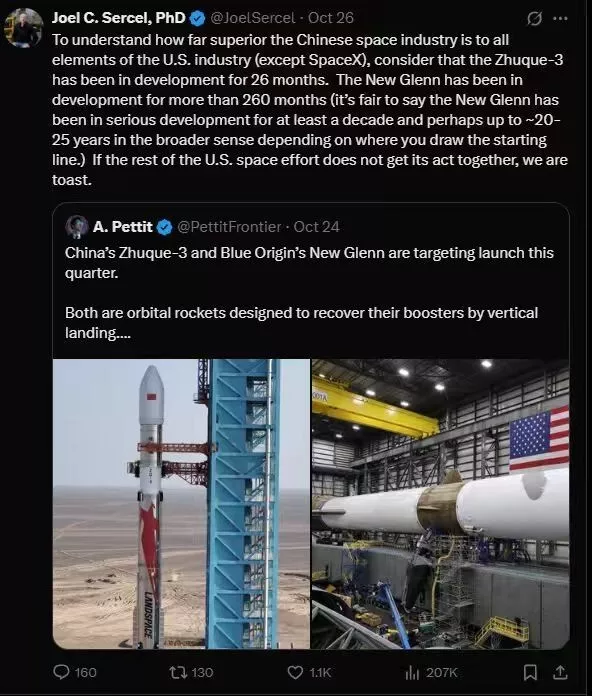 而美国航天专家乔尔·瑟塞尔博士则给出了更直白的数字对比:朱雀三号仅用了26个月发展到首飞节点,而蓝色起源的新格伦已经走了260个月,却依然在验证回收。一个零,一个数量级,构成了惊心动魄的对比。