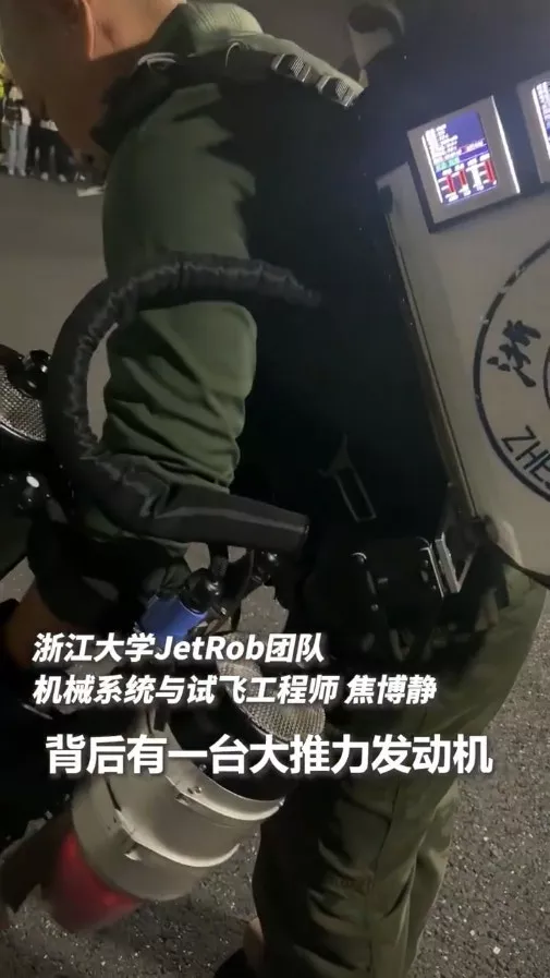 这项由浙江大学团队研发的创新科技,让穿戴者宛如电影中的钢铁人,能够腾空而起并在高空完成各种动作。(微博@共青团中央)