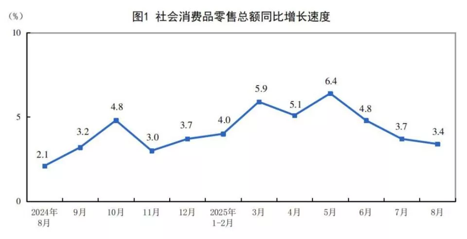 汽车稳增长、家电谋升级、3C调结构,国补的流水重塑了制造业的上下游。但这种增长仍是短期的。在财政杠杆的放大下,企业提前兑现了未来的销量,消费者提前透支了后续的需求。国家统计局数据显示,2025年8月份,社会消费品零售总额39668亿元,同比增长3.4%,增速自五月以来接连放缓。