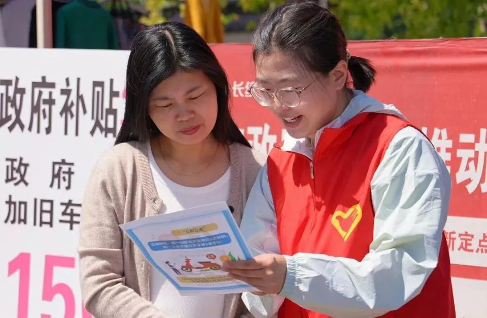 ● 江苏省海安市墩头镇青年志愿者向过往群众宣传消费品国家补贴的有关政策。图源:视觉中国