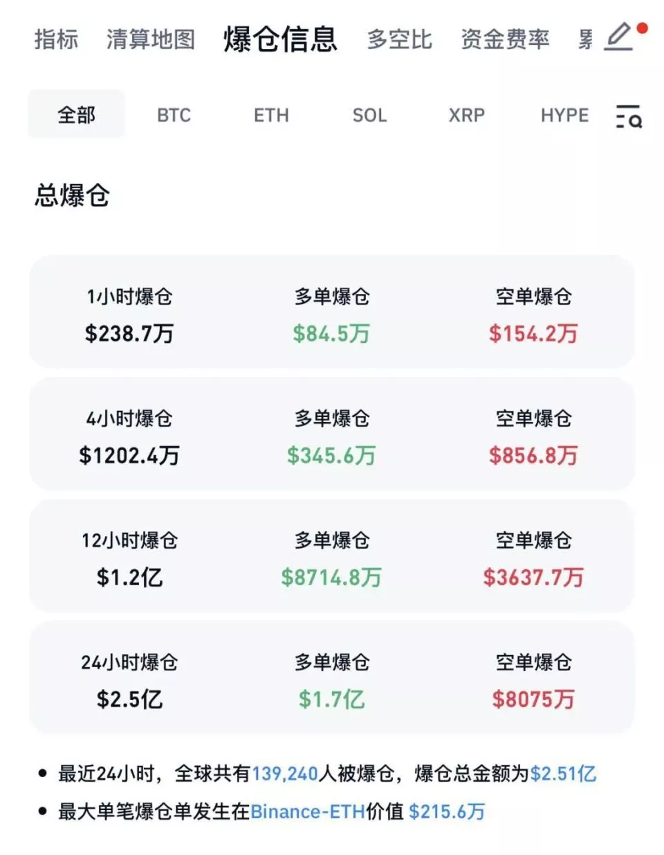 CoinGlass数据显示,最近24小时,加密货币全球共有近14万人爆仓。