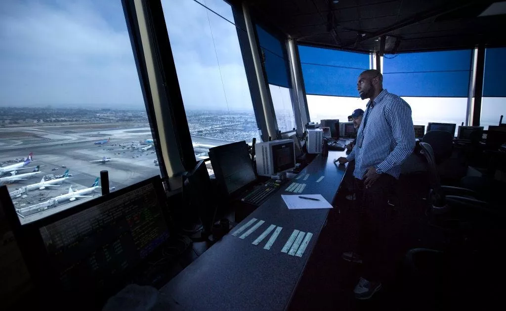 2016年6月24日,美国加州洛杉矶,空中交通管制员在洛杉矶国际机场的控制塔驾驶室指挥飞机升降。(Getty)