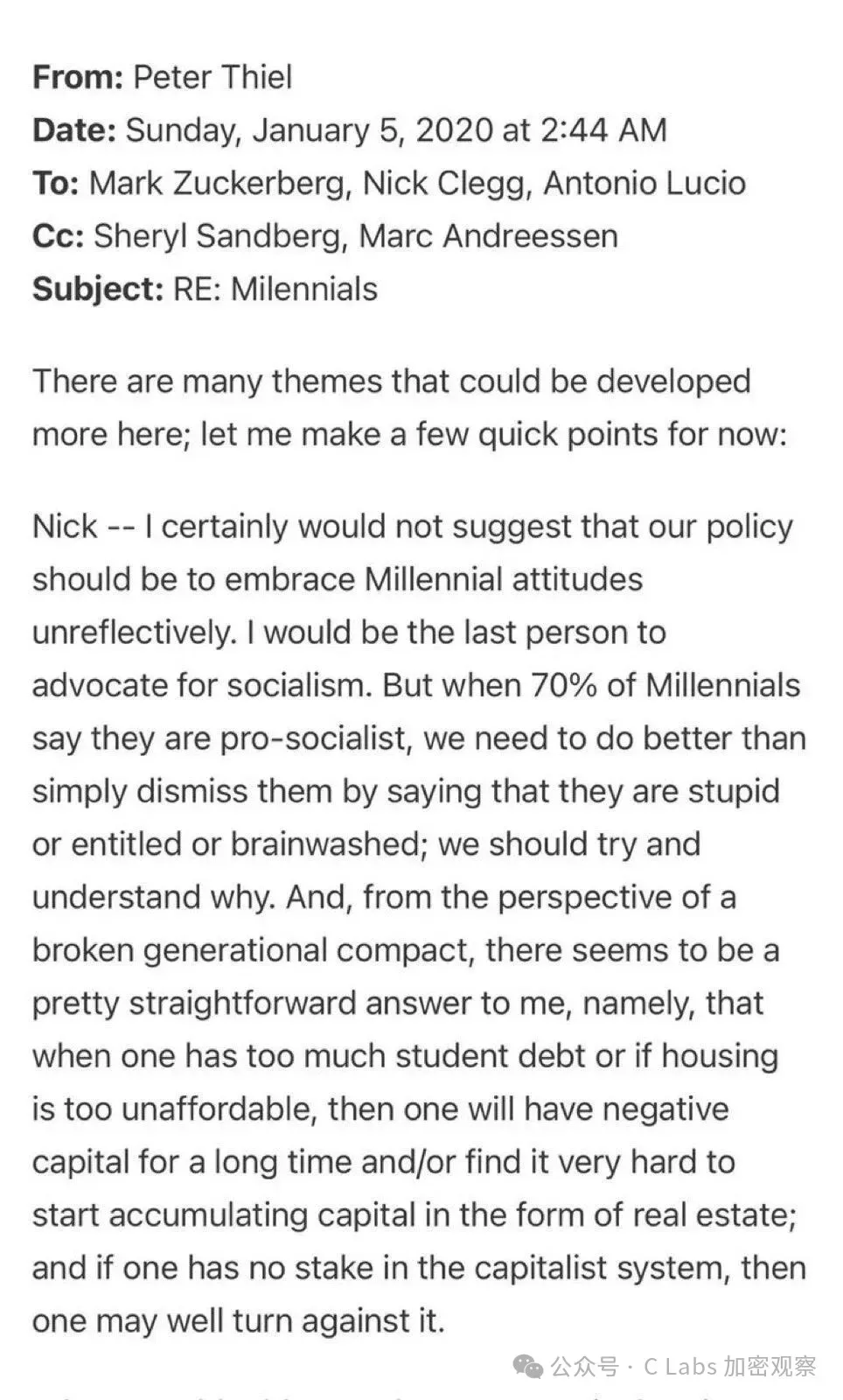 在 2020 年一封写给 Mark Zuckerberg 的内部邮件中,Peter Thiel 写道: