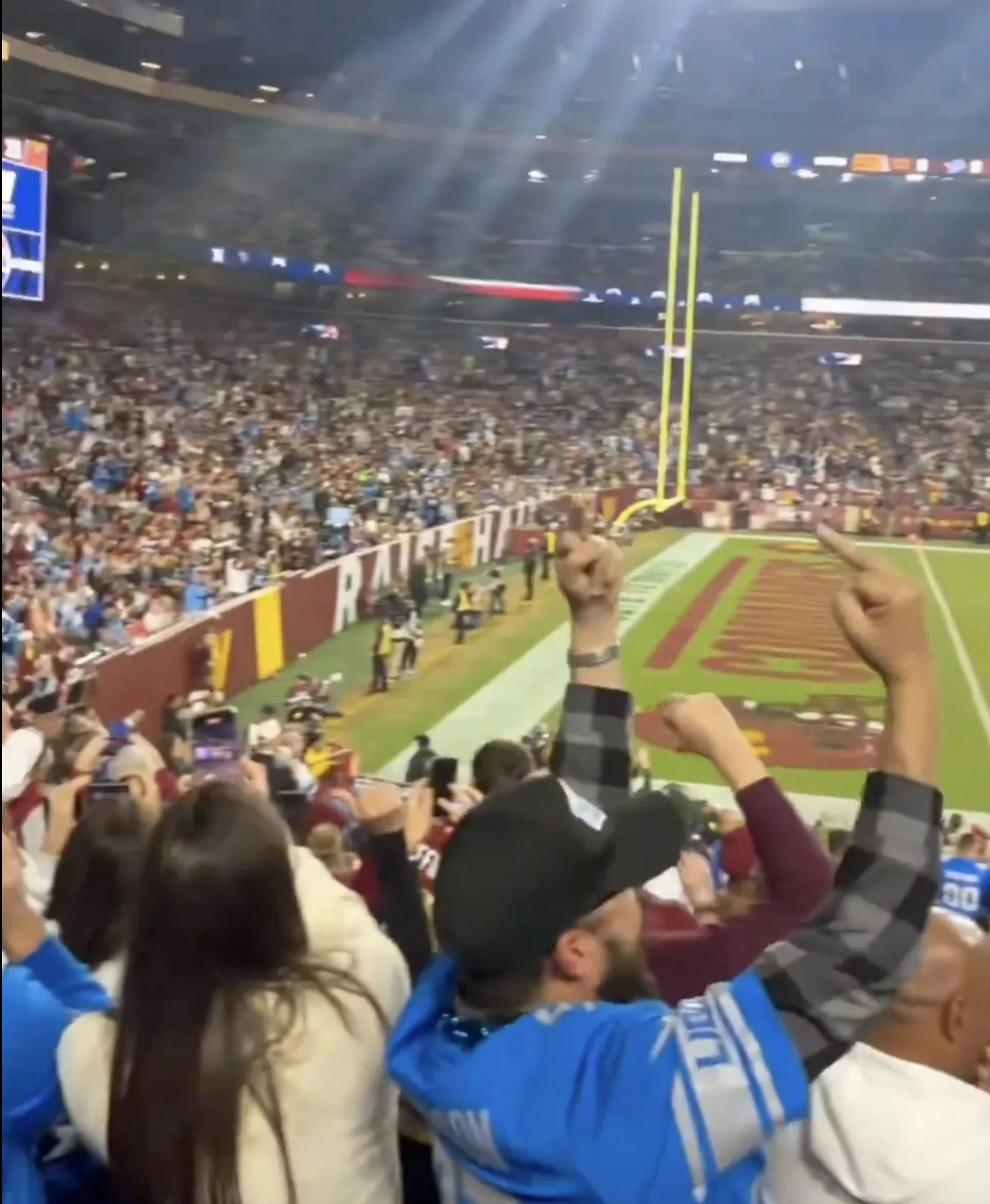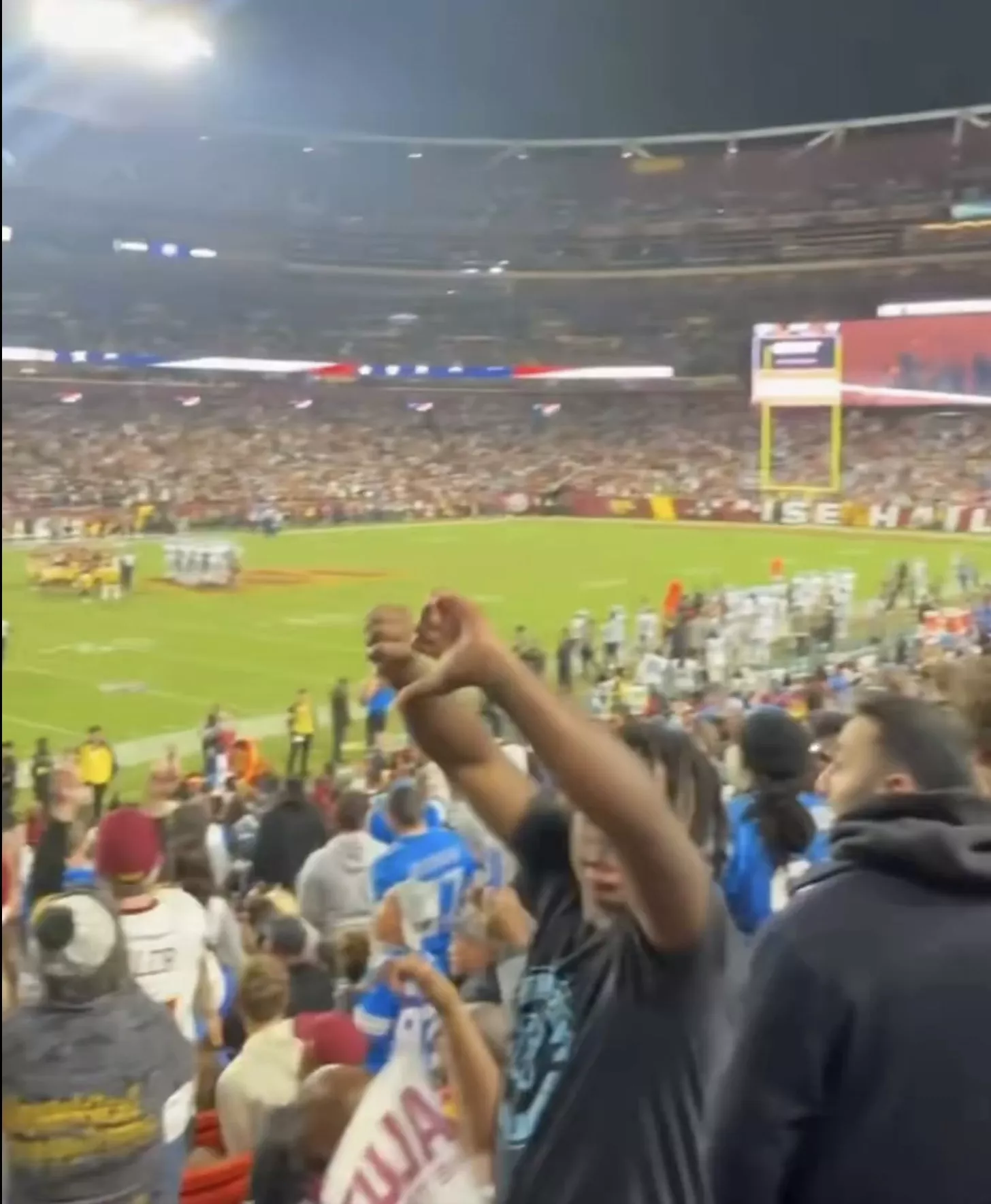 Listen to fans at the Washington Commanders and Detroit Lions game boo Donald Trump.