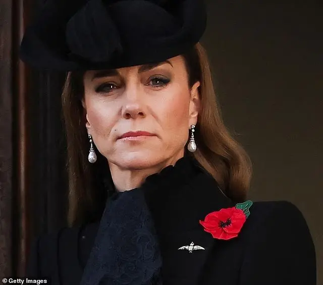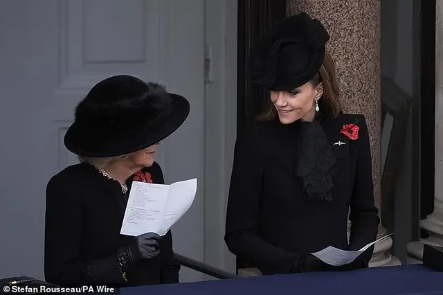 卡米拉和凯特都身着黑色服装,以表达对逝者的哀思。不同于以往,现年43岁的凯特为自己增添了一条蕾丝丝巾,瞬间让原本沉闷的黑色灵动了一些。此外除了虞美人胸针之外,她还佩戴了一枚金色的英国皇家空军胸针,以此向她的祖父彼得·米德尔顿表达敬意。