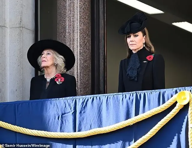 卡米拉王后和凯特王妃,出现在不远处的外交、联邦和发展事务部的阳台上,按照惯例观看了这一仪式。