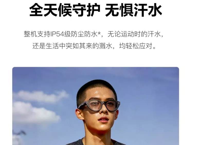 眼镜重量为39g,採用钛合金转轴,可调节鼻託,支援拆卸替换,整机支援IP54级防尘防水。该眼镜搭载Sony 1200万像素镜头,支援4K相片和1440p/30fps视频拍摄,内置EIS智能防抖算法,确保跑步、骑行时画面清晰流畅。