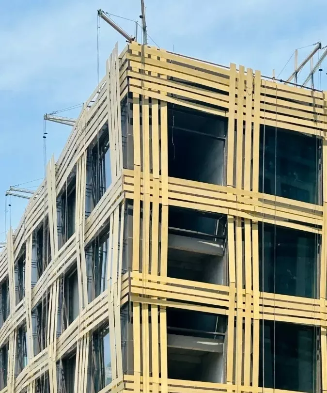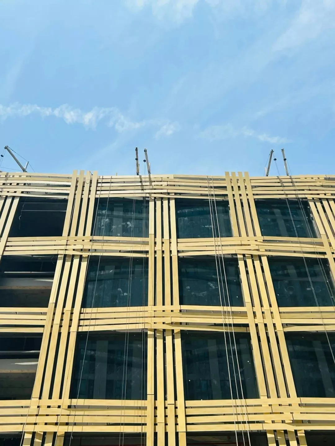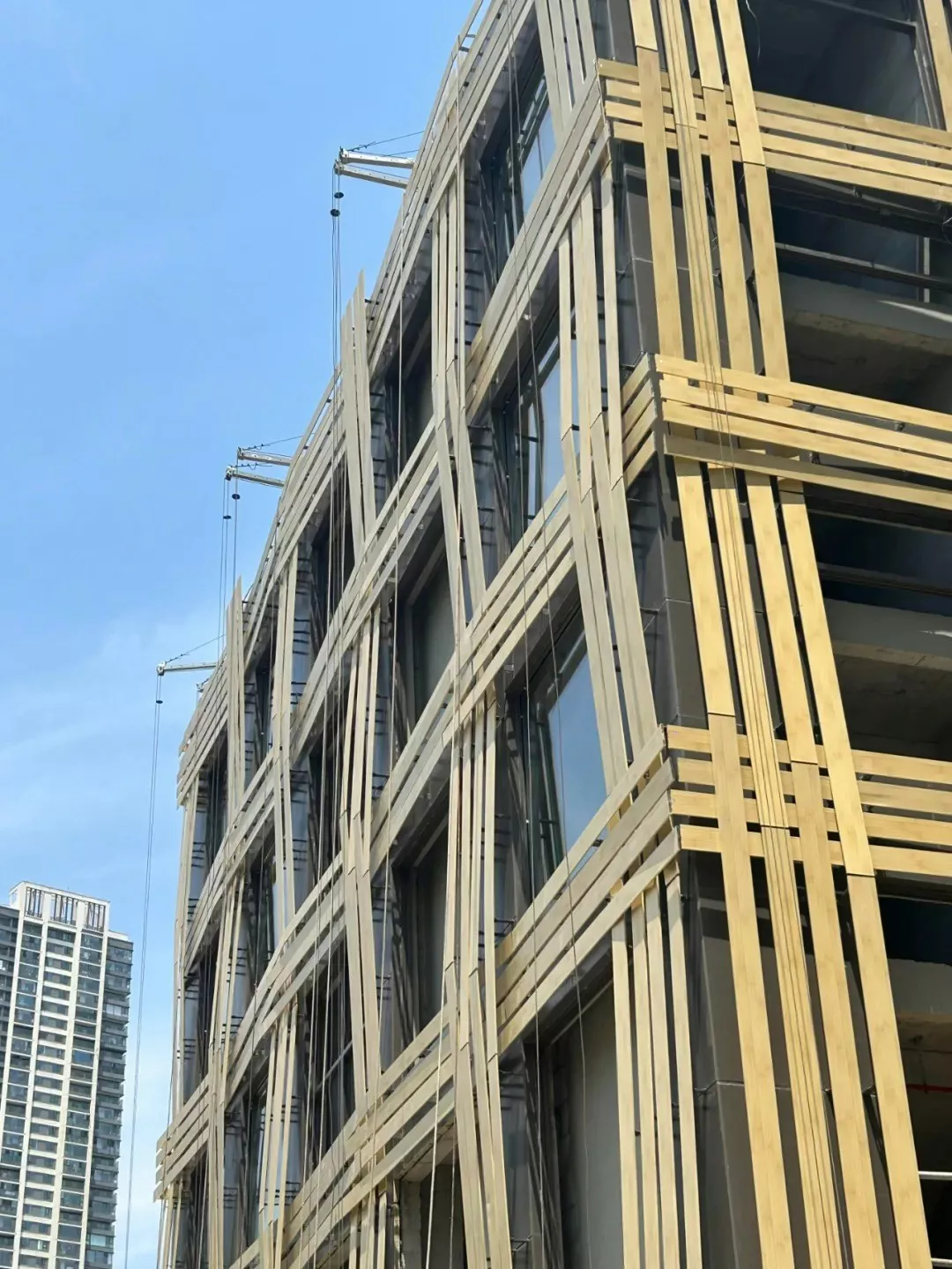 目前酒店还在施工中,远远看去,外牆上一道道裸露的木条和铝板纵横交错,确实神似打包大件快递时用的防护木架。走近一点,还能看到一些铝板接口处有点粗糙,整体还处于“半成品”状态。