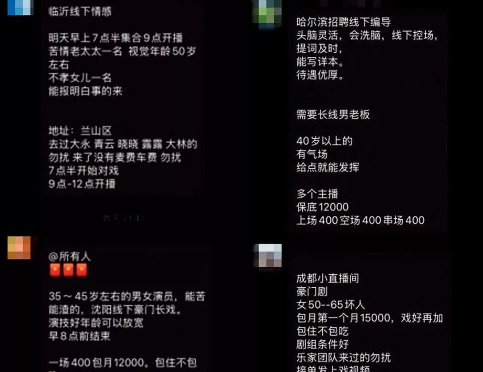 “主播每天按剧本演绎不同人设,相比带货,他们自称更像演员。”闫欣瑶告诉《中国新闻周刊》,他们平时都在微信群里接活,有人发布新角色需求、上工时间和地点,主播觉得合适就去“试戏”,通过直接开播,认真干一天赚2000元很轻松。