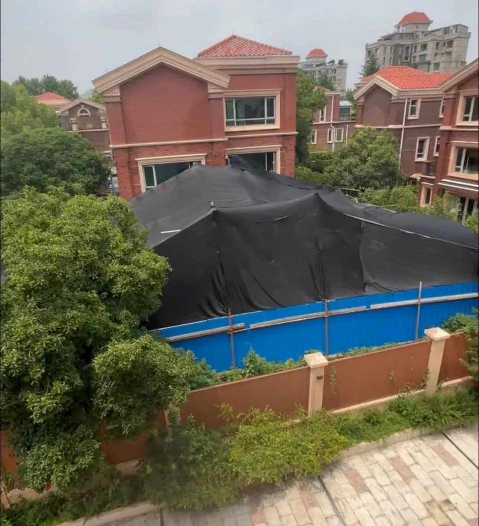 开工后,黑色的网布将房子后院整个罩住,无论从上空还是从地面都无法看到内部的情况,只是经常有工人进出,往里运钢筋水泥、往外运土,噪声不断。