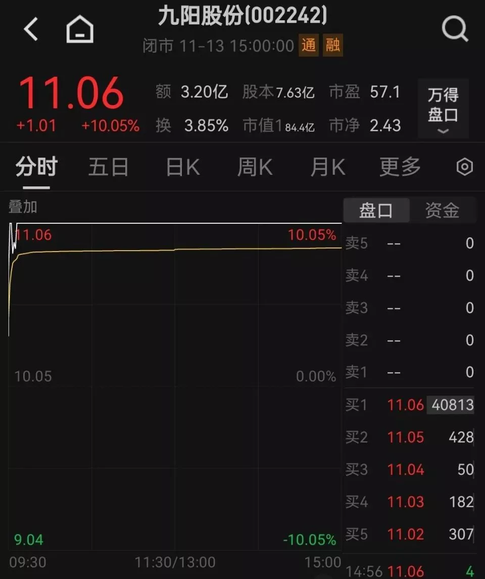 值得一提的是,伴随着“哈基米南北绿豆”豆浆的爆火,11月13日早盘,九阳股份开盘直线拉升,封死涨停,股价报11.06元。