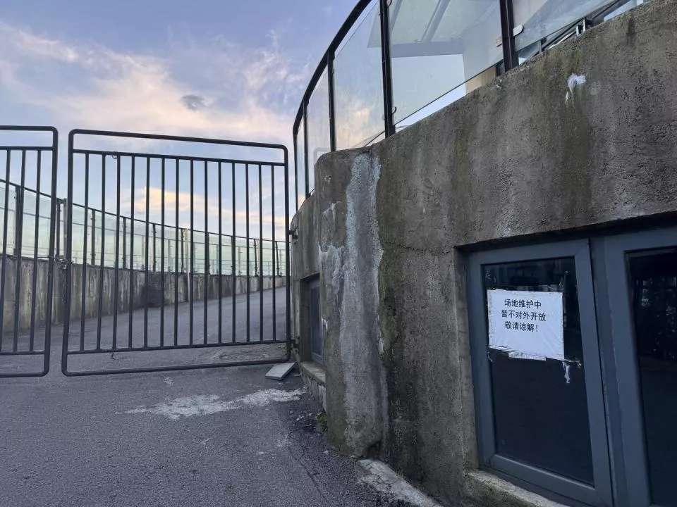 然而,从小路抵达月亮山山顶后,进入“人造月亮”内部的道路也已被大门封锁,登上玻璃栈道的楼梯入口也由多个水桶遮挡无法通行。现场遗留的建筑垃圾随处可见,建筑物也因经年无人管护变得锈迹斑斑。综合体外的路边告示牌上张贴着“场地维修中,暂不对外开放”标语。