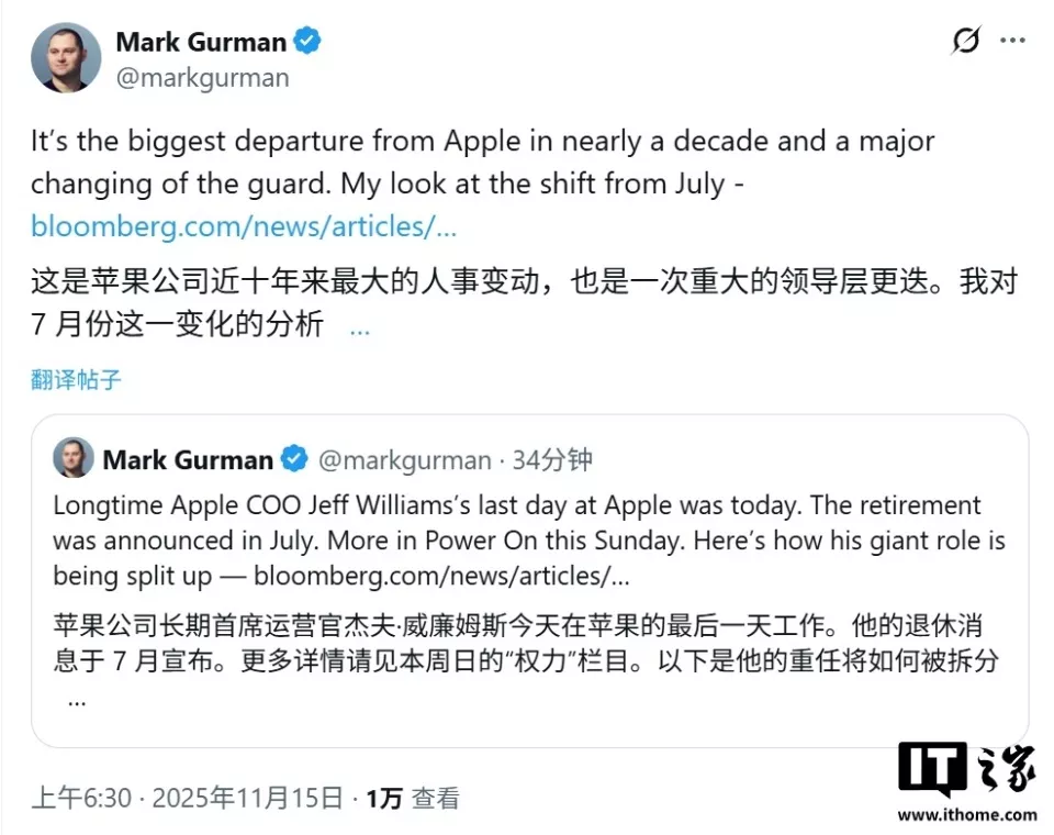 IT之家 11 月 15 日消息,彭博社的马克.古尔曼(Mark Gurman)今天(11 月 15 日)在 X