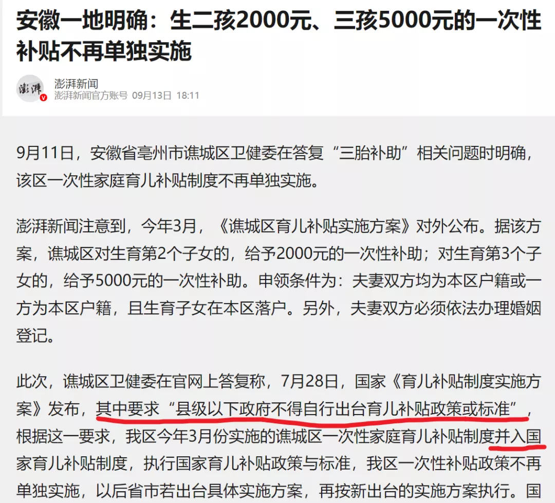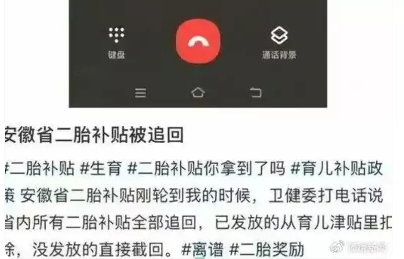“安徽省二胎补贴刚轮到我的时候,卫健委打电话说省内所有二胎补贴全部追回,已发放的从育儿津贴里扣除,没发放的直接截回。”