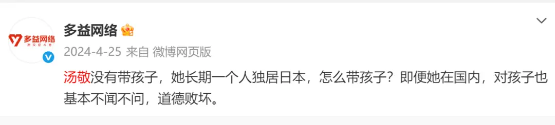 多益网络还称汤敬没有带孩子,她长期一个人独居日本,没法带孩子,即便在国内,对孩子基本不闻不问。