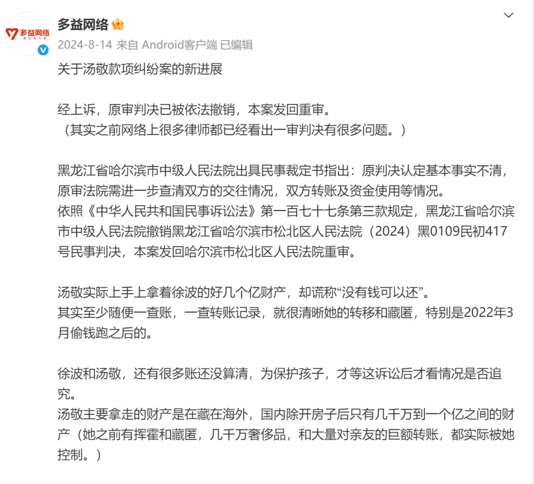 2024年8月14日,多益网络发文公布徐波与汤敬款项纠纷案新进展,经上诉,原审判决已被依法撤销,本案发回重审。