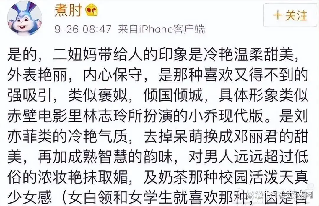 从网友截图看,当年煮肘老师这样形容二妞妈:外表艳丽,内心保守,倾国倾城,类似林志玲所扮演的小乔现代版,是刘亦菲类的冷艳气质,奶茶那种校园活泼天真少女感。。。