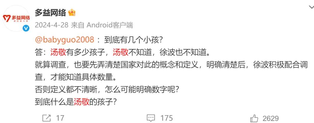 多益网络称在去年发文称,汤敬有多少孩子,汤敬不知道,徐波也不知道。