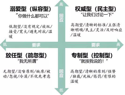 高响应、高要求的权威型(Authoritative);低响应、高要求的专制型(Authoritarian);高响应、低要求的放任型(Indulgent)和低响应、低要求的忽视型(Neglectful)。