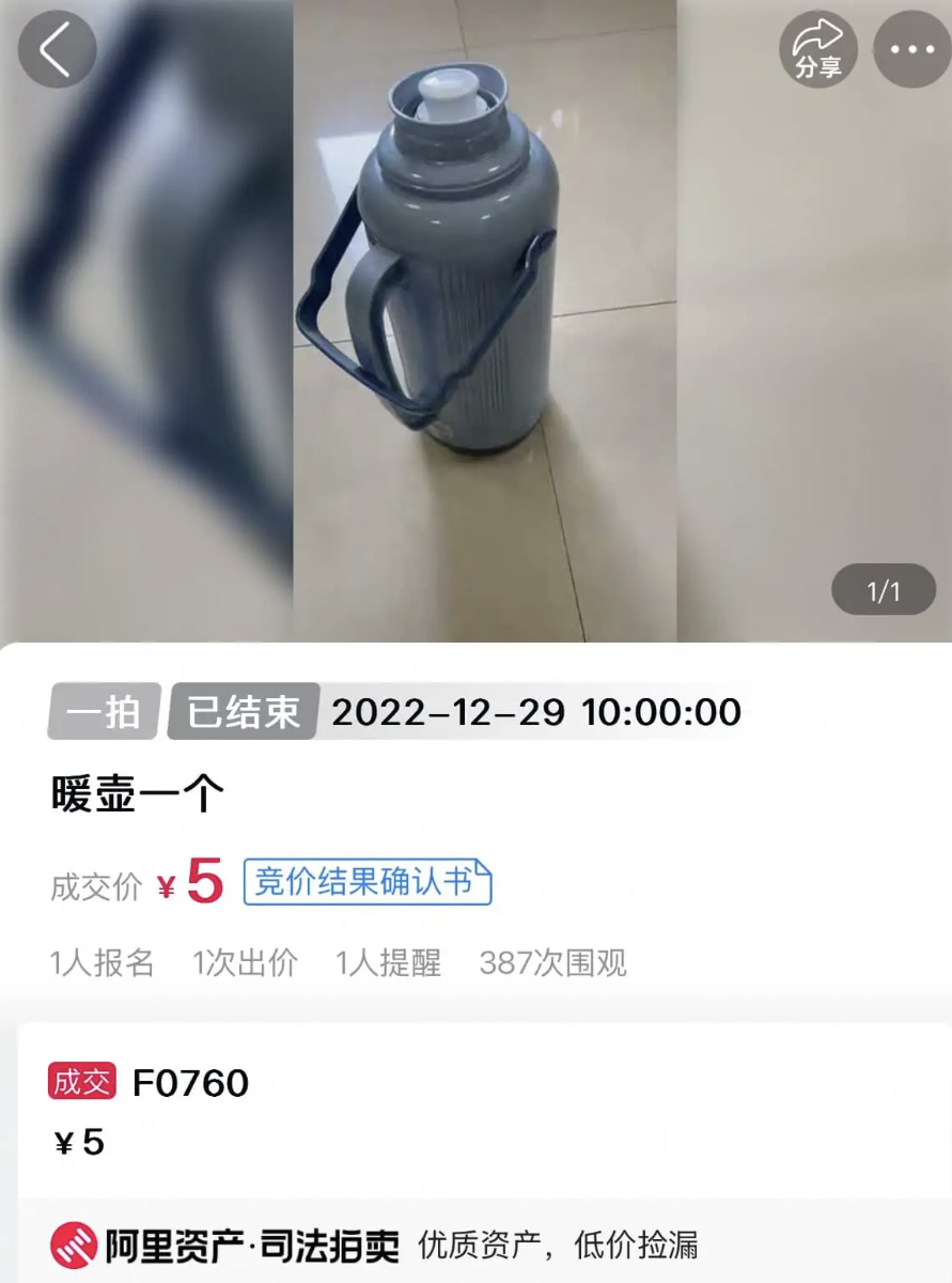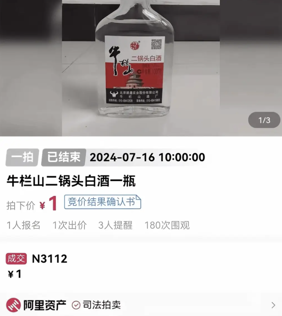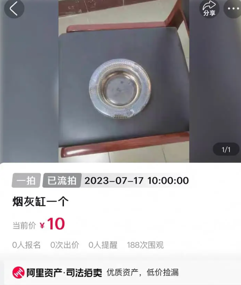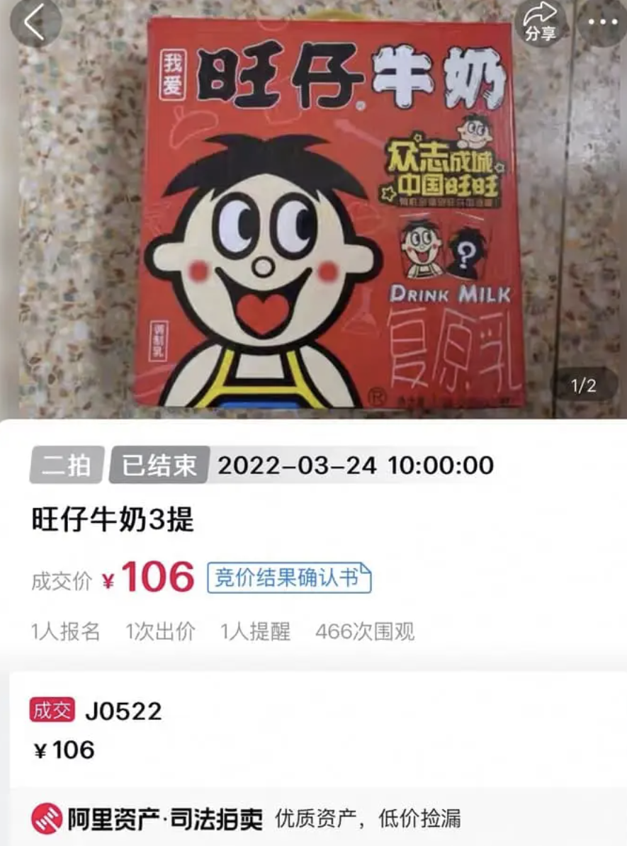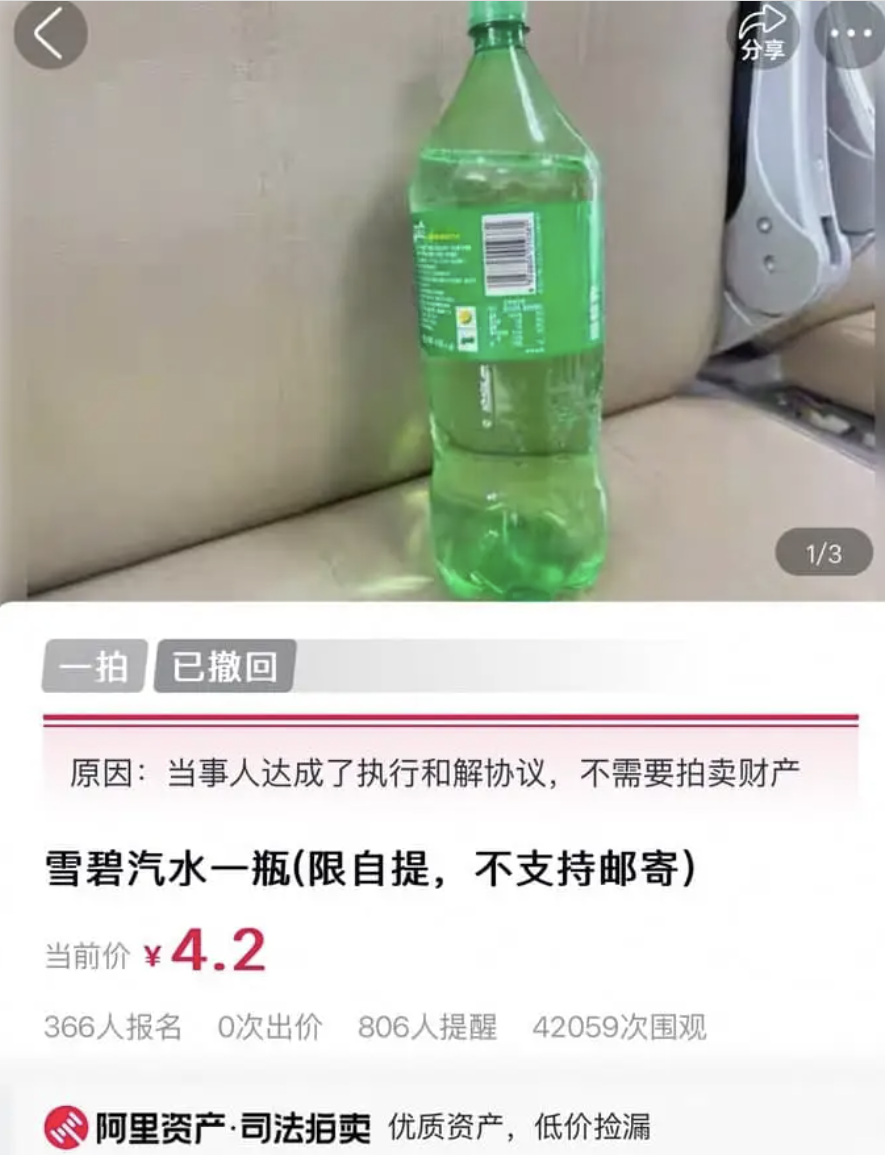“去年见过一瓶被法拍的大雪碧,是两个被执行人共有的,起拍价四块二,大润发搞活动都得五块多。”