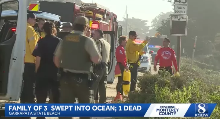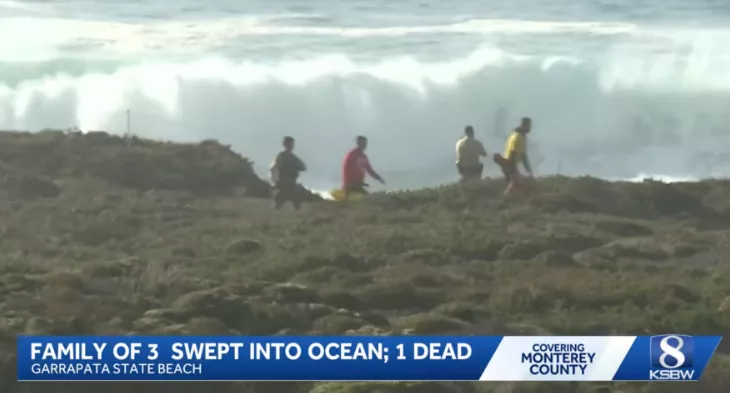2025年11月14日中午约12点50分,一家四口在Garrapata海滩沿公路1号附近观浪时,突遭高达15至20英尺(约4.6至6.1米)的巨浪袭击。