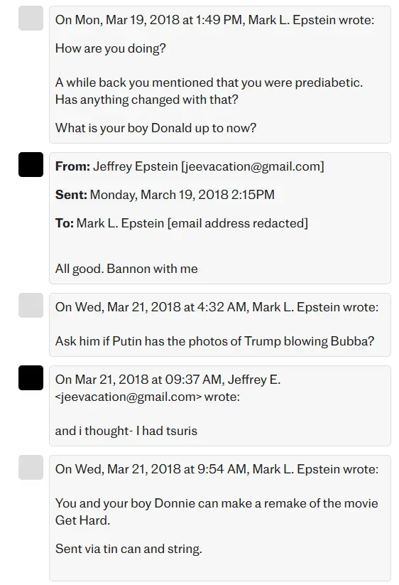 在众议院公布的一封2018年3月的邮件中,马克·爱泼斯坦对杰弗里·爱泼斯坦说,让他去问特朗普前首席策略师史蒂夫·班农,普京手里是否有“特朗普给‘Bubba’口交的照片”。