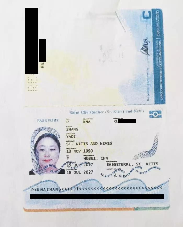 钱志敏化名“ZHANG Yadi”,用虚假的中美洲岛国圣基茨和尼维斯(Saint Kitts and Nevis)入境英国。