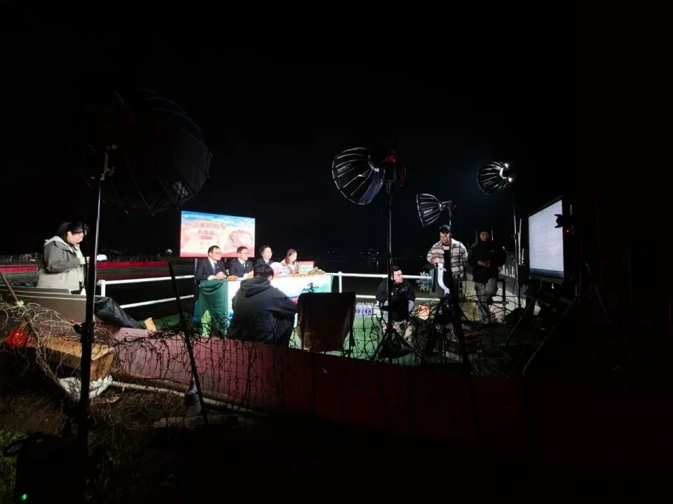 直播当日,正好是10月底,螃蟹肥美的时候。执行团队忙完当天的工作,赶到秋兰家蟹塘时,离开播还有一个小时。他们在塘口搭了个架子,摆好借来的直播设备。
