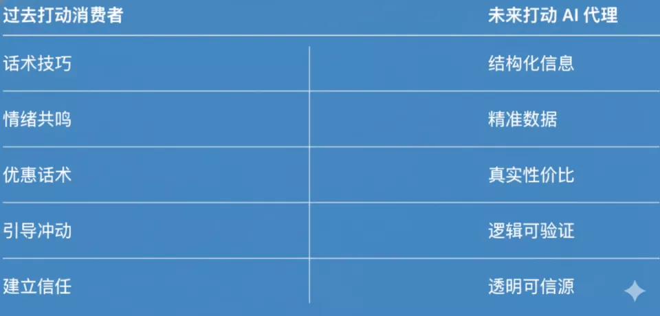 过去,打动消费者靠的是:话术技巧、情绪共鸣、优惠陷阱和引导冲动。未来,品牌需要打动的AI代理,它只认:结构化的信息、精准的数据、真实的性价比、可被验证的逻辑,以及透明可信的来源。