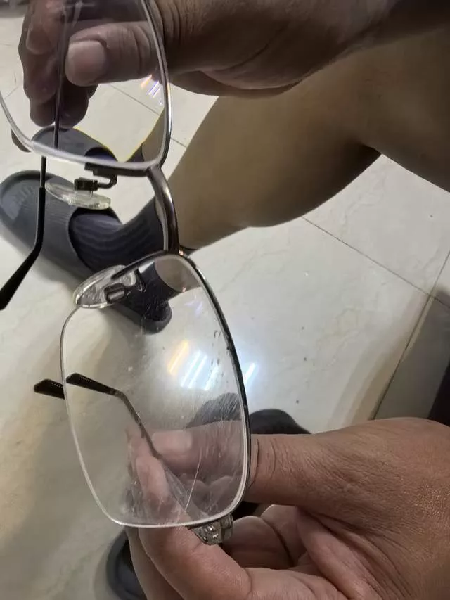 “我这副眼镜价值2100元,镜架是记忆金属钛材质,后来我请朋友将扭曲的镜架调整恢复。镜片是蔡司的,一片580元,刮花的镜片无法恢复如初。”