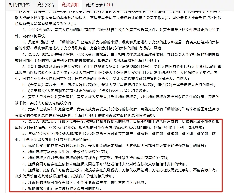 竞拍须知显示,出让方稠州银行已经对拍卖标的的来源、瑕疵和风险进行了充分的提示和披露;竞买人已经对拍卖标的的来源、瑕疵和风险进行了充分尽职调查,完全知悉并接受拍卖标的的所有瑕疵、风险。