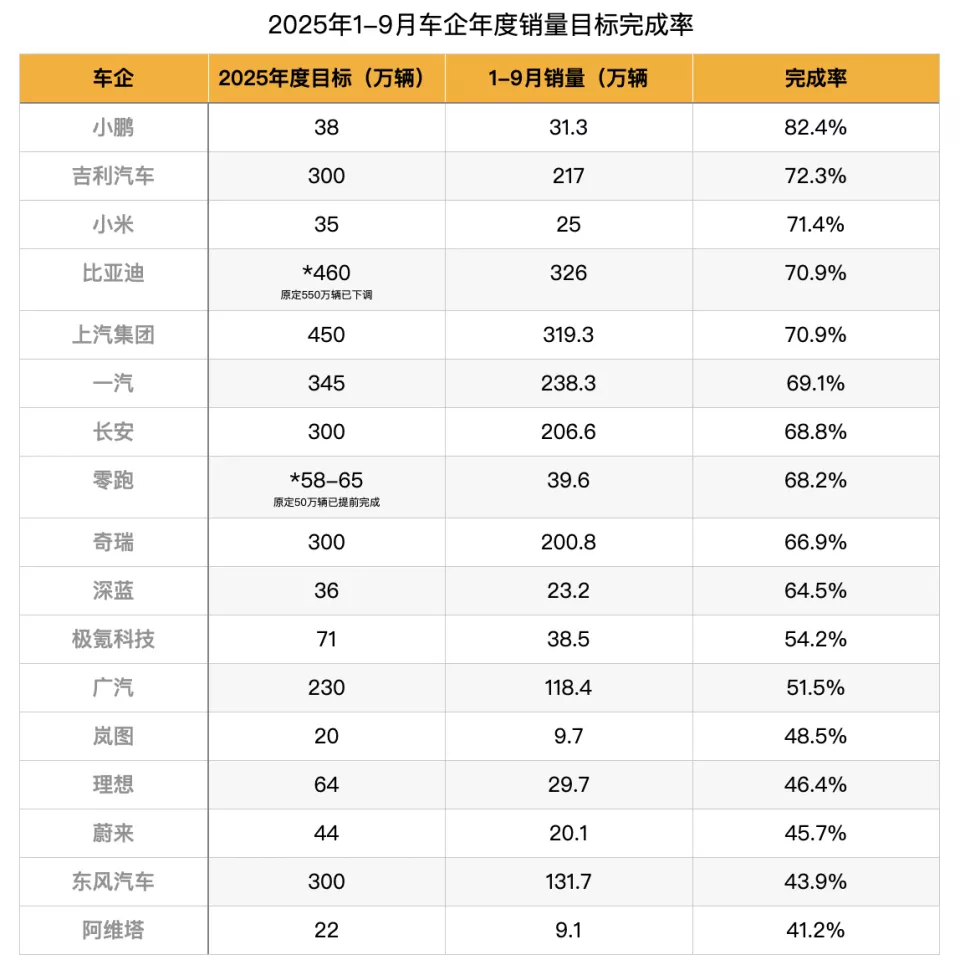 实际上不仅是豪华品牌,2025年国内车企的日子普遍艰难,根据我们之前统计过的前三季度车企销量目标完成情况来看,绝大多数车企无法完成年初设定的KPI。