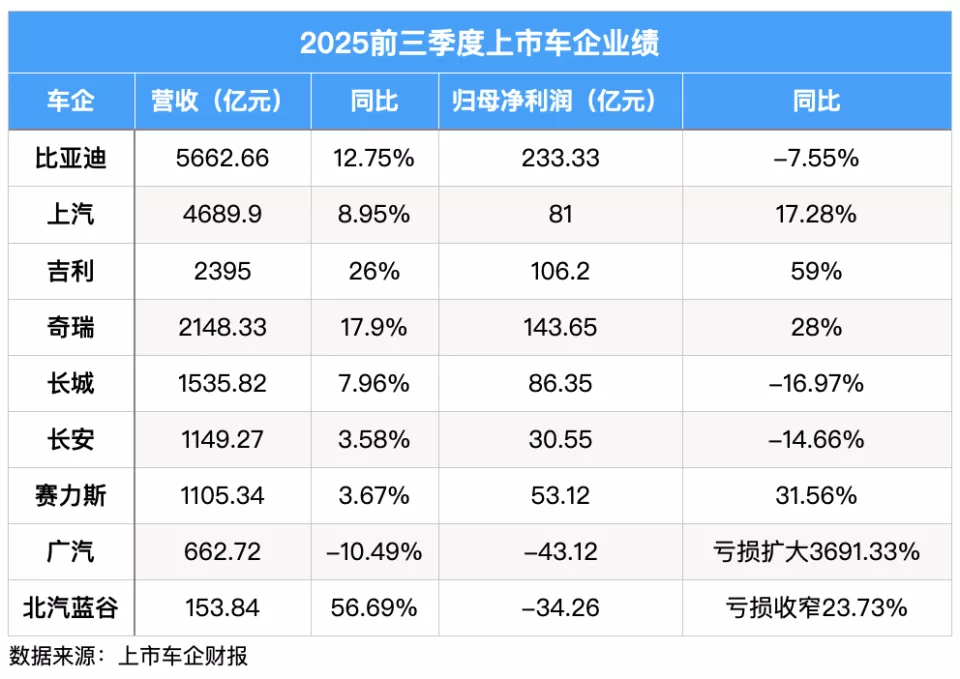 虽然在政策推动下,下半年汽车销量出现了大幅增长,但一定程度上也透支了明年的需求。而即便是销量上涨的车企,也面临增收不增利的窘境。我们统计了九家上市车企前三季度的业绩,其中两家出现亏损,四家车企的净利润同比出现下滑。