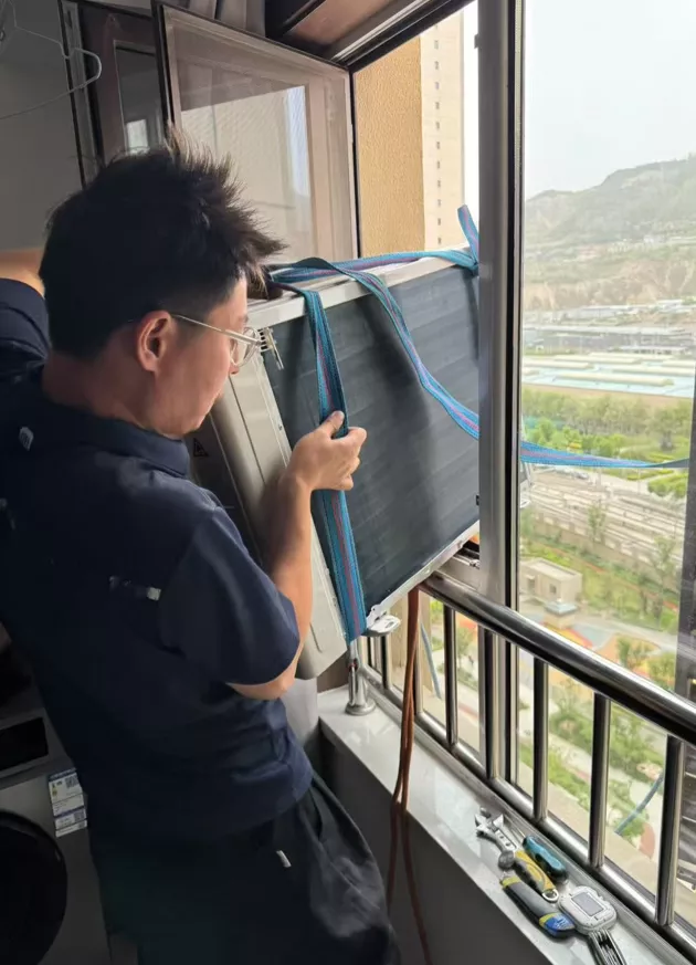 网友@吟月家就是窗户太小,装好她住在凤凰层,所以把空调外机从天台吊下,过程也相当顺利。