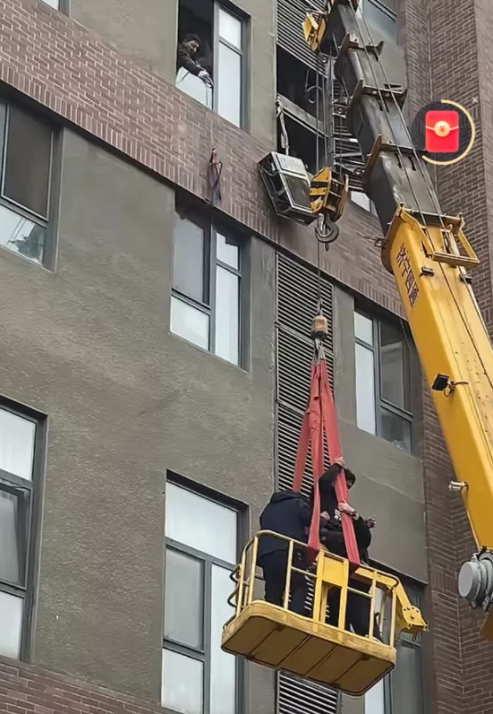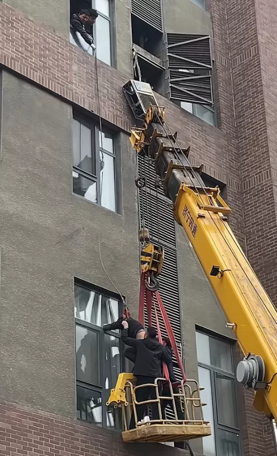 据称当时一辆刚好经过的吊车,司机看到后马上启动吊臂对空调工进行施救,最终安全到达地面。