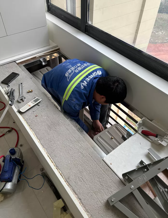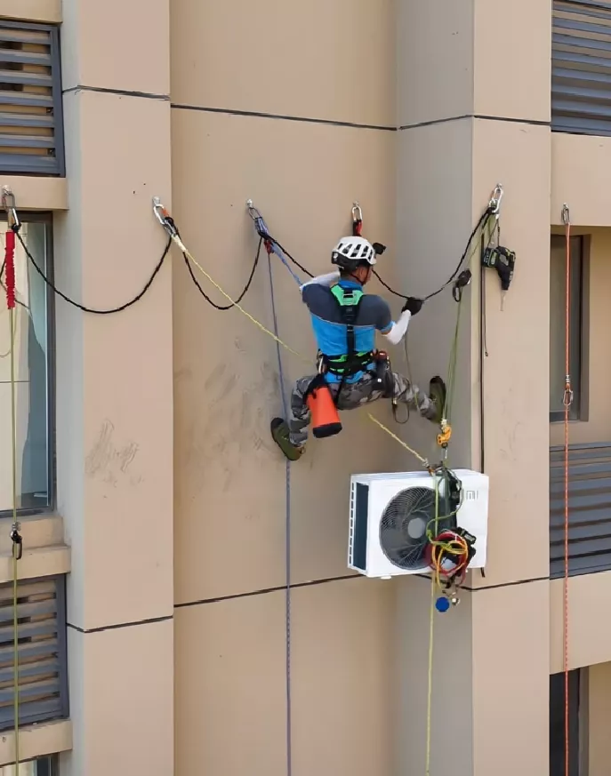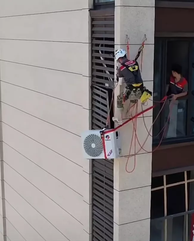 空调机位都位于建筑的外面,安装时只能从附近的窗户爬出外墙,通常是两人配合,一人在室内传递空调外机,一人绑上安全绳进行高空作业。