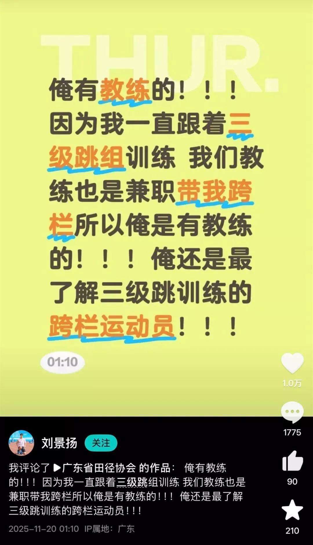 刘景扬笑称自己是“最懂三级跳的跨栏运动员”,这可不是凡尔赛,而是在委婉地告诉大家,告诉国家田径队: