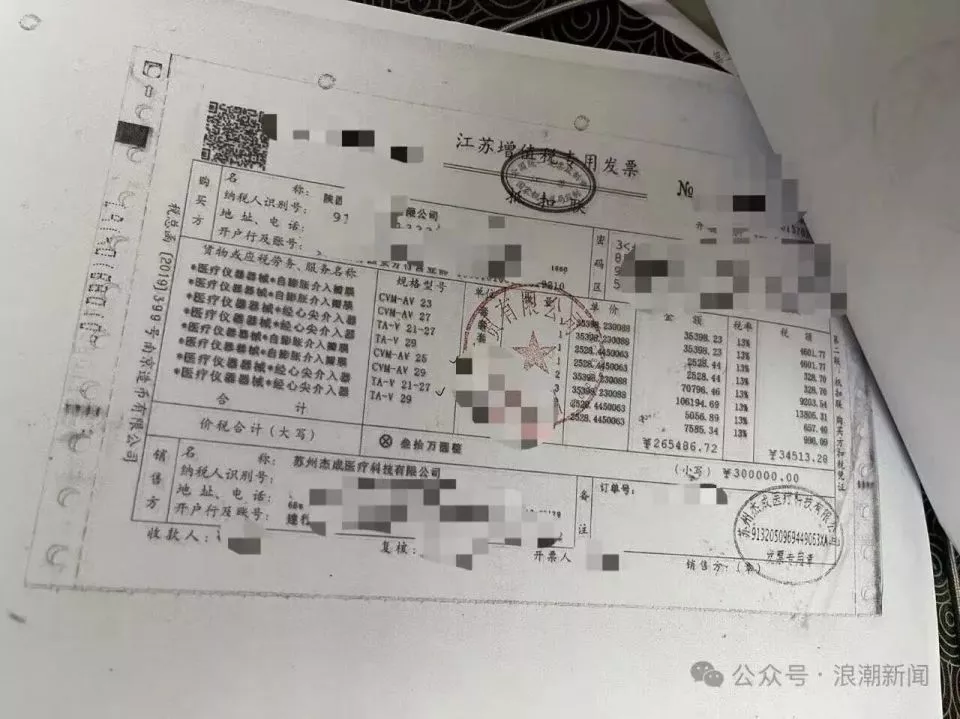 李女士向记者提供了一份《江苏增值税专用发票》。该发票由西安市市场监管综合执法支队在对该案件调查过程中从经销商处调取。医院使用的心脏瓣膜厂家为“苏州杰成医疗科技有限公司”,发票记载显示,供应商为“陕西某商贸有限公司”。2020年11月,“陕西某商贸有限公司”从销售方“苏州杰成医疗科技有限公司”采购7套瓣膜器械,合计26万多元。其中包括医院为李女士父亲做手术使用的瓣膜产品,当中,经心尖介入器,型号规格TAV21-27,单价为2528元;自膨胀介入瓣膜,型号规格CVM-AV25,单价为35398元。