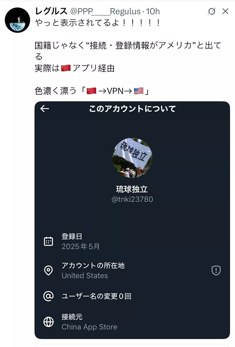 “关于此帐号”功能上线后,反制假帐号的实质效果迅速显现。一名专业的网友在Threads上分享照片,指出自从X开始公布所在国家和使用管道后,整理了河道上一些有趣的消息,比方说“在吵冲绳独立”的帐号贴文,虽然都是以日文呈现,但一查IP,发现全是香港和中国的帐号。此外,更有人指出,如果只是公布IP位置,或许中国网军还能躲过一劫,但现在连“连线来源”都摊在阳光下,让这些网军根本“如同裸奔”。