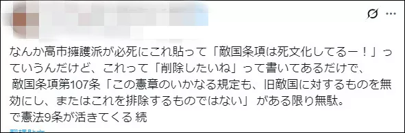 “高市早苗的支持者们拼命贴出当年的联合国决议,称‘敌国条款’已死,但(决议)上面只是写‘我想删除它’。只要联合国宪章第107条继续存在,就是白费功夫……”
