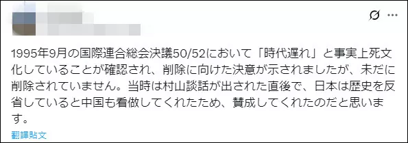 另一位网民提到,1995年联合国大会通过有关决议之际,时任日本首相村山富市刚发表了“村山谈话”,中国或许是认为日本在反思历史,才支持有关决议。