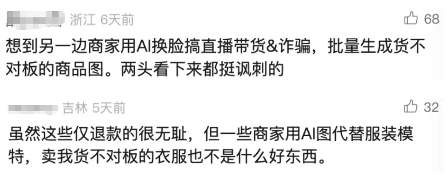 说到这里真得很讽刺,因为现在很多商家同样在用 AI 生成商品图欺骗消费者。