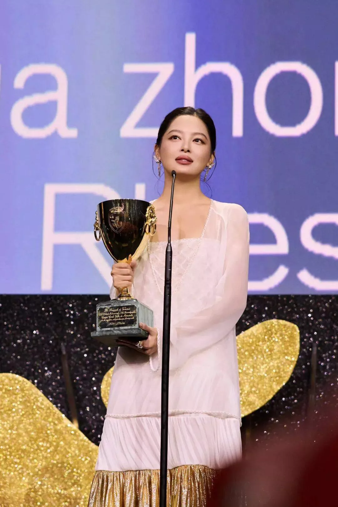 “十多年前,我刚入行的时候,吹过一个牛,说希望自己有一天能站在世界级的舞台上,成为国际巨星,但那个时候我受到了很多很多嘲笑。你看,今天我终于站在了这里,跟这个世界的很多顶级女演员同台竞技,并且得到了这个奖。我为自己感到骄傲,也为自己作为一名中国的女演员能站在这个舞台上(获奖)感到骄傲。”