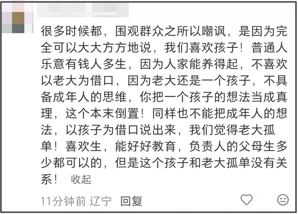 正如网友所说,如果齐溪大大方方说因为喜欢孩子所以想多生几个,大概率是不会遭到质疑的,非要提一句觉得老大孤独,就让网友觉得她在找补,越看越觉得像是找借口掩盖拼儿子失败。