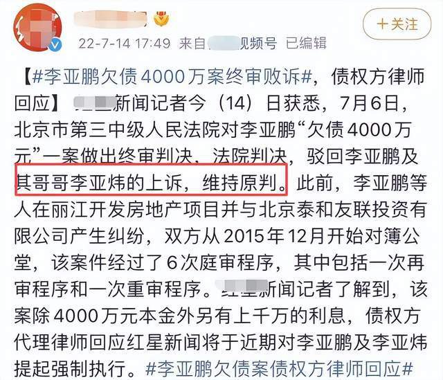 2021年3月,兄弟俩再次因为4000万债务被起诉,李亚炜作为李亚鹏的共同债务人,需要一起承担债务。