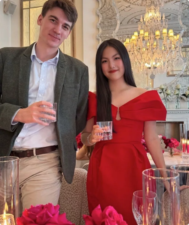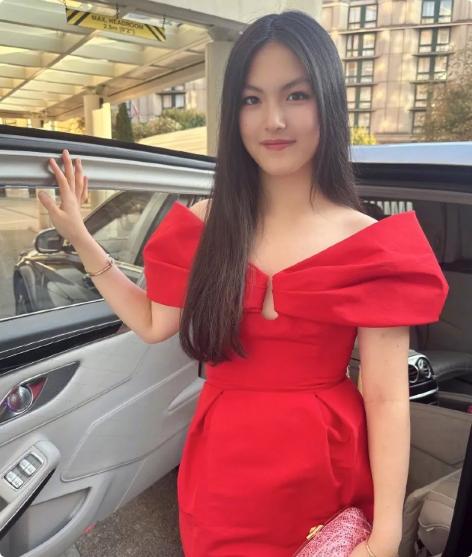 她一袭大红礼服亮相,妆发精致,举手投足都带着从容与仪式感,仿佛一位即将步入社交圈的“小名媛”。